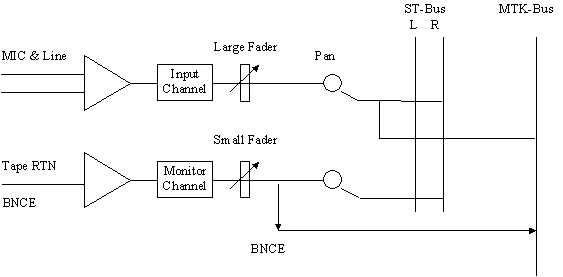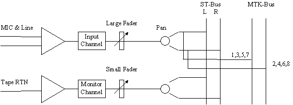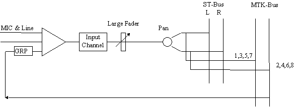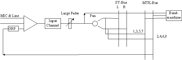 Bei Inlinepulten für 8 Spuren gehen die Kanäle 1-8 auf die Bandmaschine und auf den Stereo Bus.
